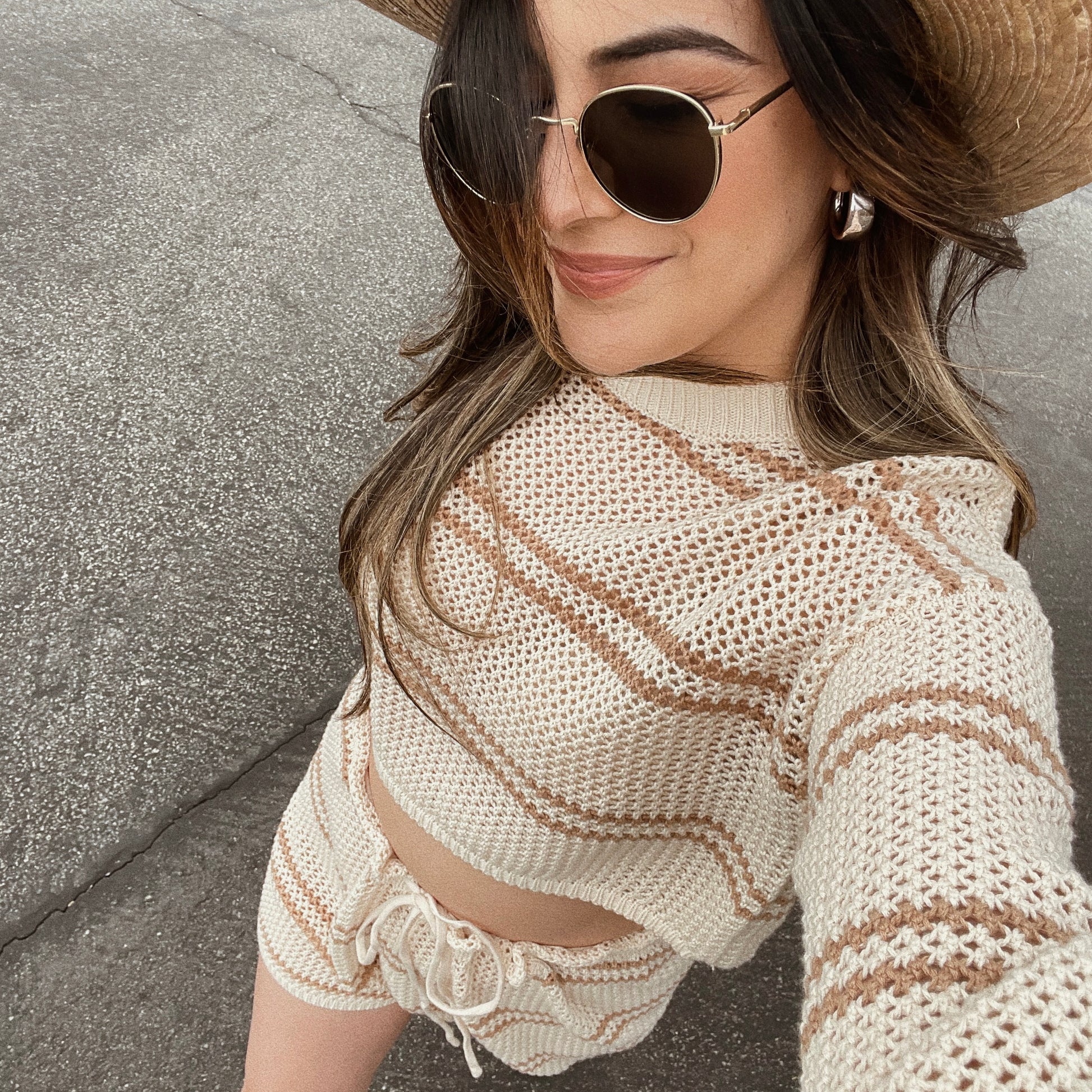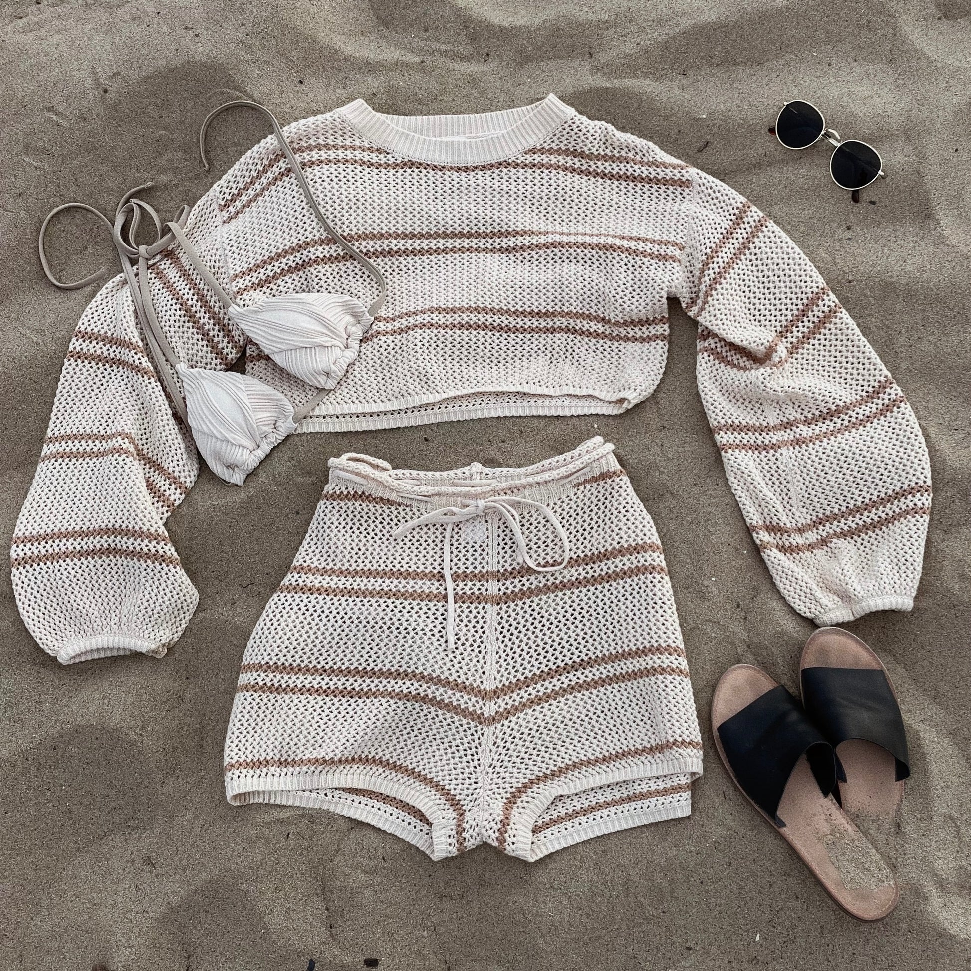 ★ The cutest summer crochet knit two-piece set! Comes with a long sleeve crop top and crochet shorts. Shorts feature an adjustable string waistband.